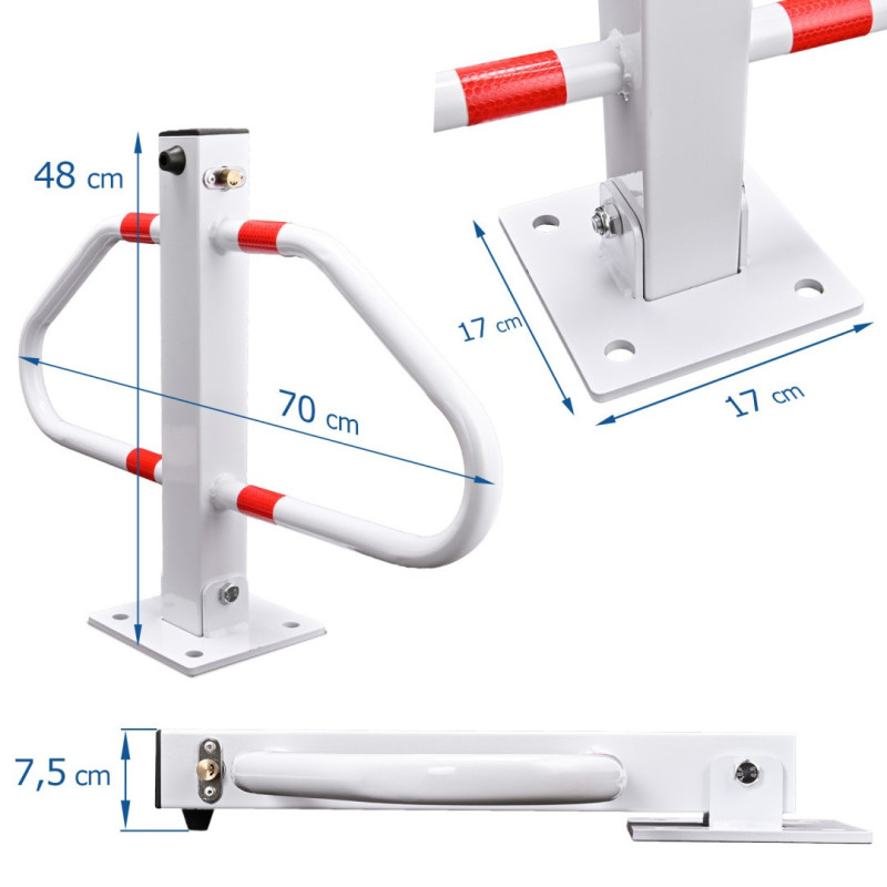 Imate parkirno mjesto koje je stalno zauzeto - koristite sklopivu parkirnu blokadu koja će spriječiti parkiranje neovlaštenih osoba. Prilikom odlaska podignite blokadu i zaključajte je. Sklapajuća zaključavajuća parkirna blokada, čvrsta i otporna. Izrađena od kvalitetnog materijala. Visina blokade je 48 cm. Izrađena od pocinčanog čelika s praškastom bojom - otporna na vremenske utjecaje. Mehanizam osigurava brzo i jednostavno sklapanje. Tehnički podaci: - maksimalna širina: 70 cm - visina: 48 cm - boja: bijelo/crvene reflektirajuće naljepnice - svijetla boja čini blokadu dobro vidljivom izdaleka - profil: 6 cm - materijal: čelik - dimenzije: 6 x 6 x 48 cm - dimenzije podnožja: 17 x 17 cm - razmak montažnih rupa: 12 x 12 cm - težina: 5 kg Sadržaj pakiranja: 3 x ključ, 4 x metalna tipleći vijakaPreuzimanje