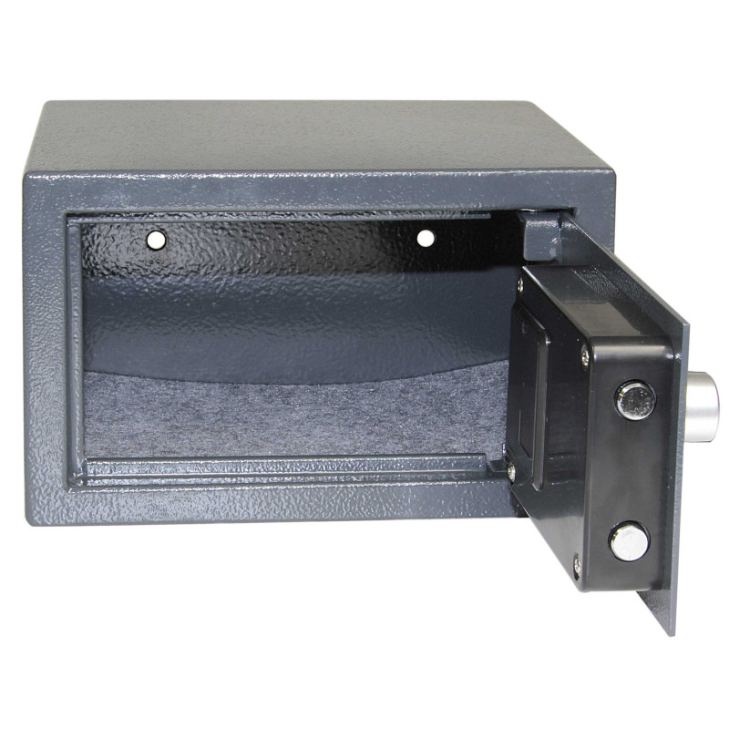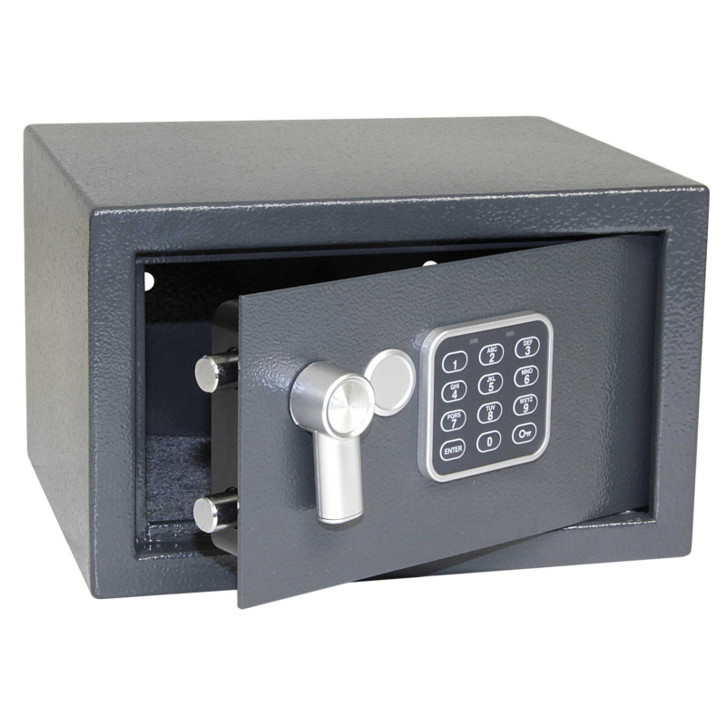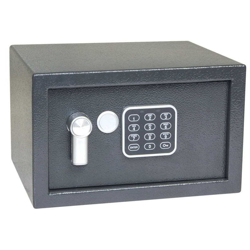 Čelični sef s elektroničkim bravom, brojčanom tastaturom i polugom za otvaranje.