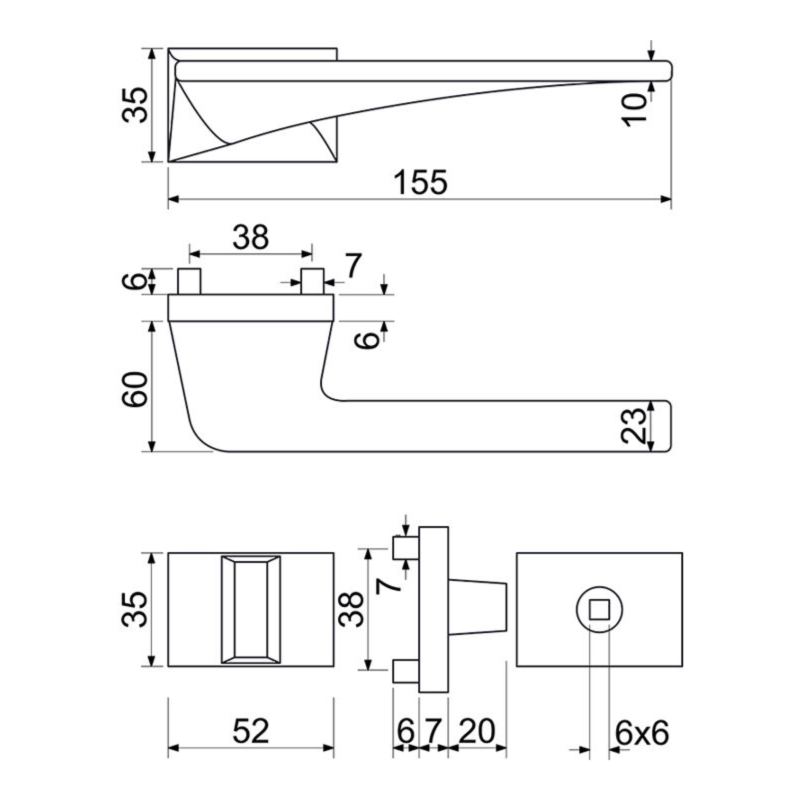 - U WC izvedbi, pakiranje sadrži kvaku s kvadratnim otvorom veličine 6 x 6 mm i redukcijom 6/8 mm.