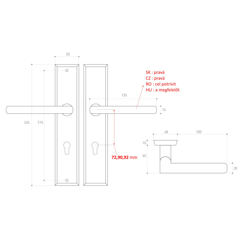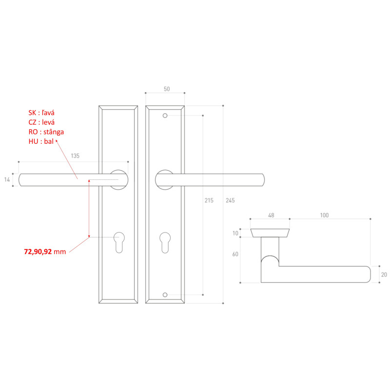 Maksimalna debljina vanjskih vrata na koje je moguće montirati kvaku METRO pomoću standardnog seta za montažu (dio pakiranja) je otprilike 90 mm. S obzirom na dizajn, kvake METRO dostupne su u LIJEVOJ i DESNOJ konfiguraciji. Iz slike u galeriji proizvoda odredite stranu sigurno.