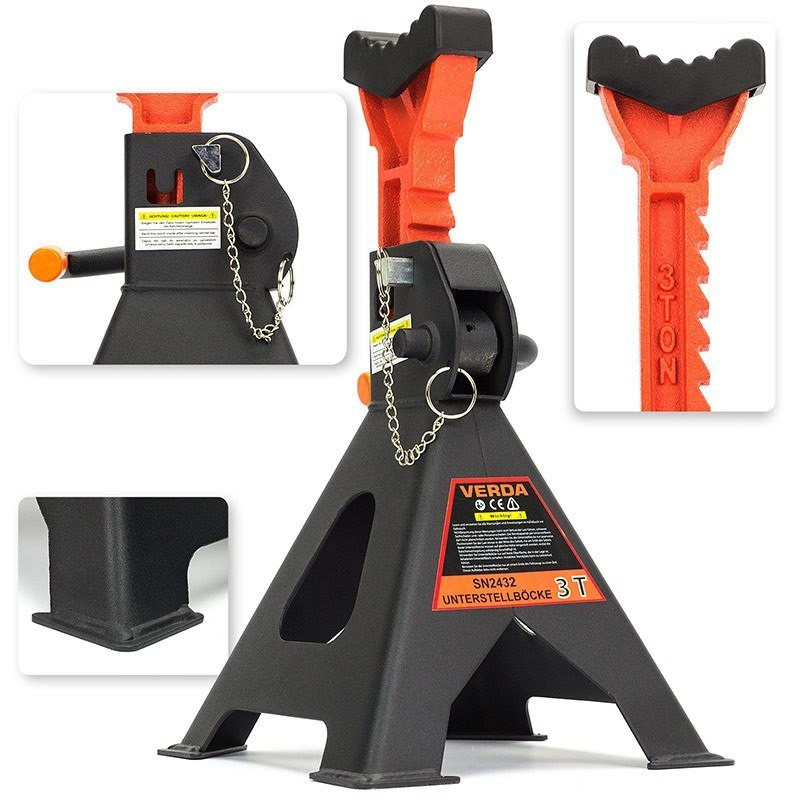 Pojmovi pod auto 3T SN2432 - set dva podrživača s nosivošću od 3 tone, opremljenih zaštitnom gumom i sigurnosnim čavlom.
