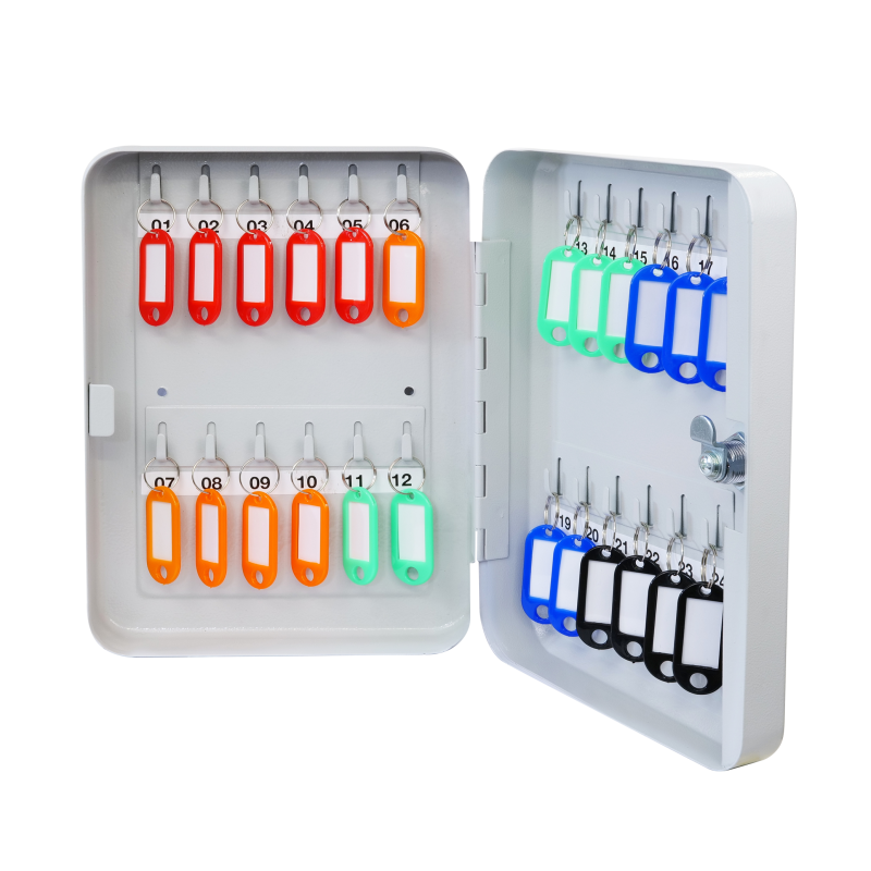 Čelična poštanska kutija za ključeve, uključuje obojane oznake i prstenove za ključeve. Na jednostavan i pregledan način možete organizirati veliku količinu ključeva. Kutiju možete zaključati i tako zaštititi sadržaj - ključeve. Idealno je montirati je na zid ili unutar ormara. Oznake imaju papirnati uložak na kojem možete napisati tekst koji će odrediti na primjer naziv vrata, ormara ili ladice.