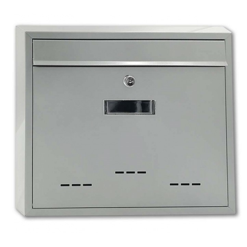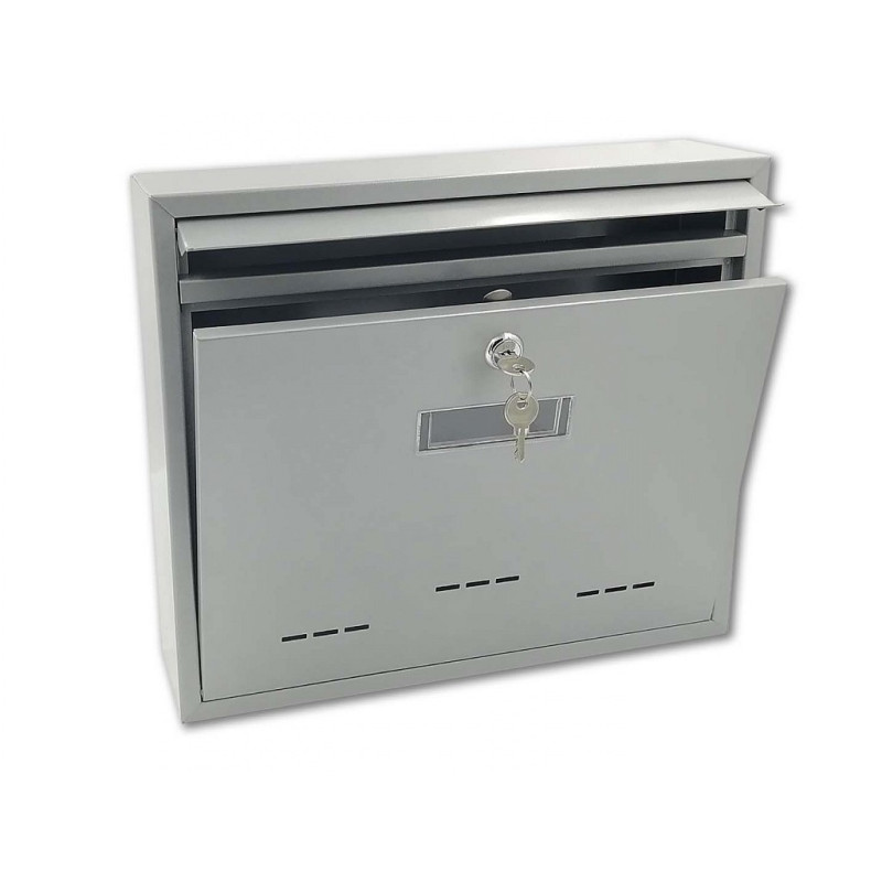 Čelična poštanska kutija u srebrnoj boji, koja ima prozor za dolaznu poštu na vratancima. Kutija je pravilnog oblika pogodna za upotrebu u zgradama. Veličina kutije odgovara dostavi pošte u A4 formatu. Dostupna je i u drugim bojama. Vratanci se otvaraju prema dole.