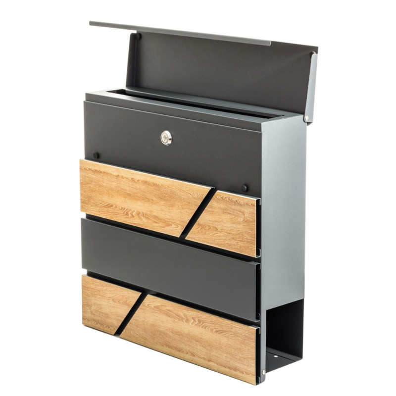 Kvalitná poštová schránka vyrobená s jedinečným dizajnom, ktorý kombinuje antracitovú farbu s imitáciou dreva. Bola navrhnutá pre pohodlie užívateľa a s prihliadnutím na súčasné estetické trendy. Je vybavená prídavnou priehradkou na noviny a väčšie letáky. Horný kryt schránky chráni korešpondenciu pred vlhkosťou. Sada obsahuje montážne skrutky, pričom otvory sú pripravené na zadnej strane schránky - pre rýchlu a jednoduchú montáž.