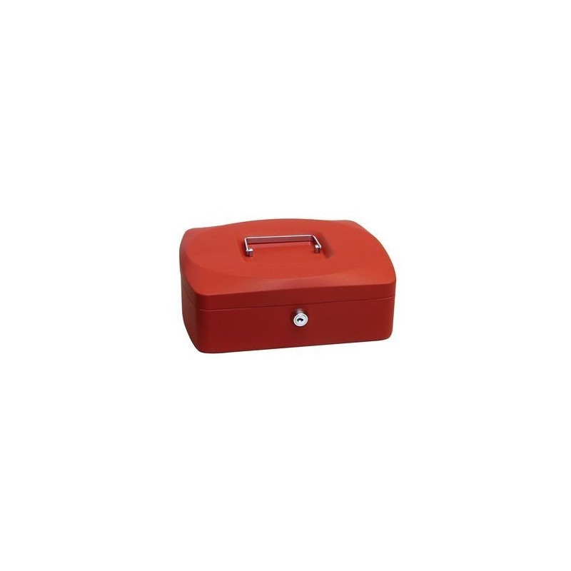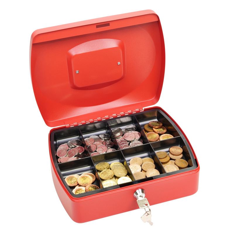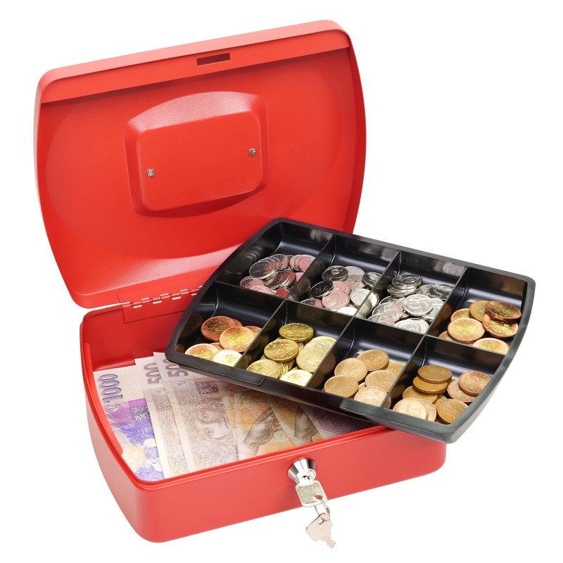Klasična čelična blagajna crvene boje za pohranu novčanica i kovanica. Posuda blagajne je odvojiva i moguće je ispod nje ubaciti novčanice.