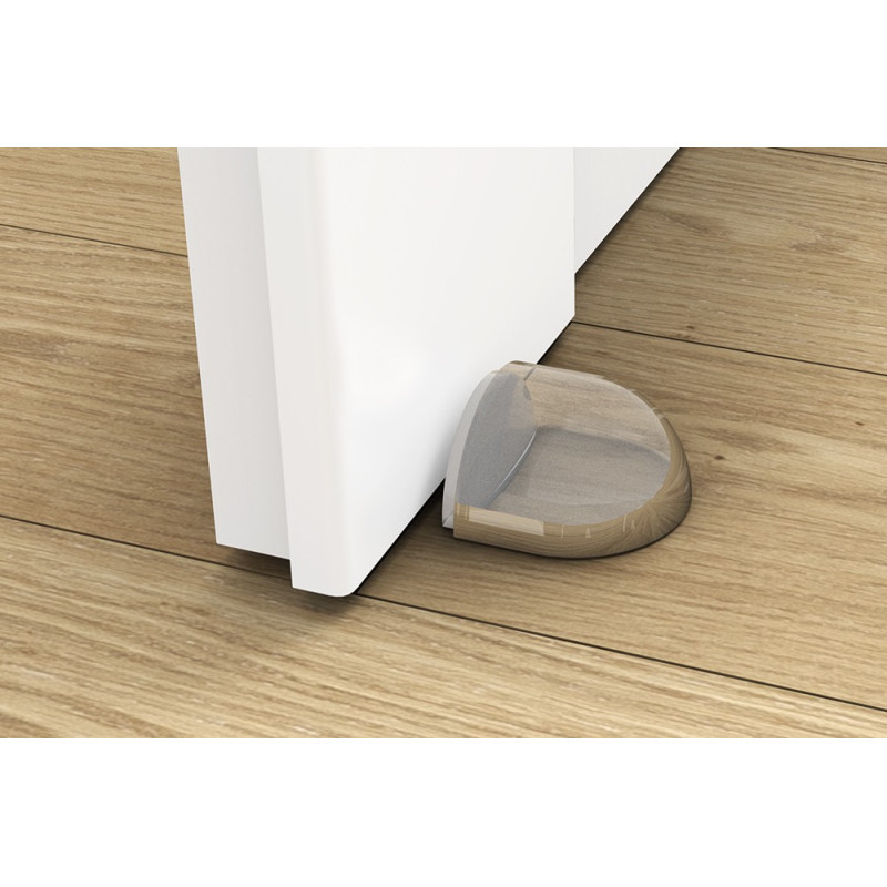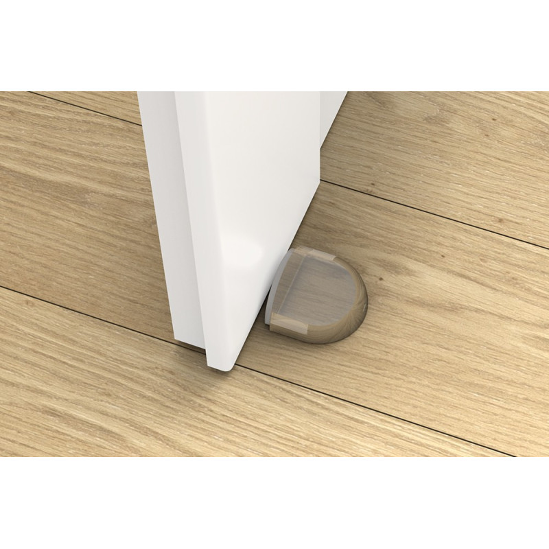 Samoljepljiva, prozirna, polukružna zaustavna guma za vrata. Zaustavna guma savršeno štiti zid od udarca vrata bez oštećenja poda. Zahvaljujući posebnom dizajnu zaustavne gume i samoljepljivom sloju, tekstura poda je i dalje vidljiva, zbog čega zaustavna guma djeluje decentno i elegantno.