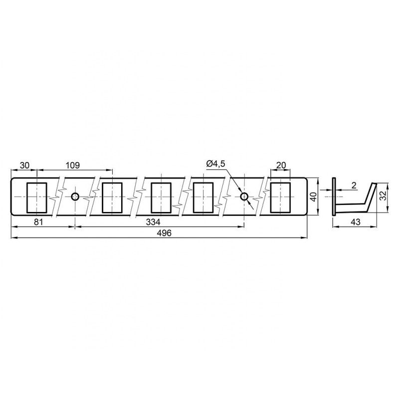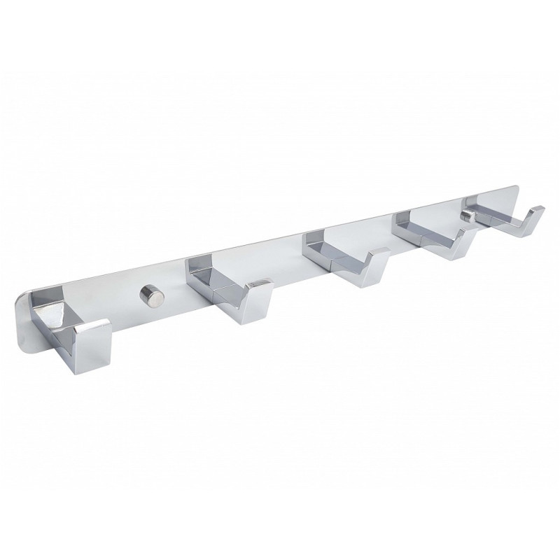 Metalni stalak na metalnoj letvi. Površinska obrada sjajni krom. Opcija sa 5 kuka. Vijci za pričvršćivanje imaju završetak na glavi sa navojem, na koji se čvrsto navrne poklopac za skrivanje vijka.